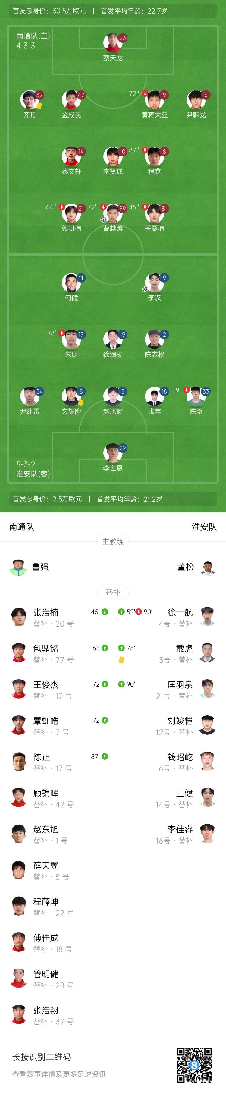 伤停补时3分钟。全场比赛结束,南通队1-1淮安队。