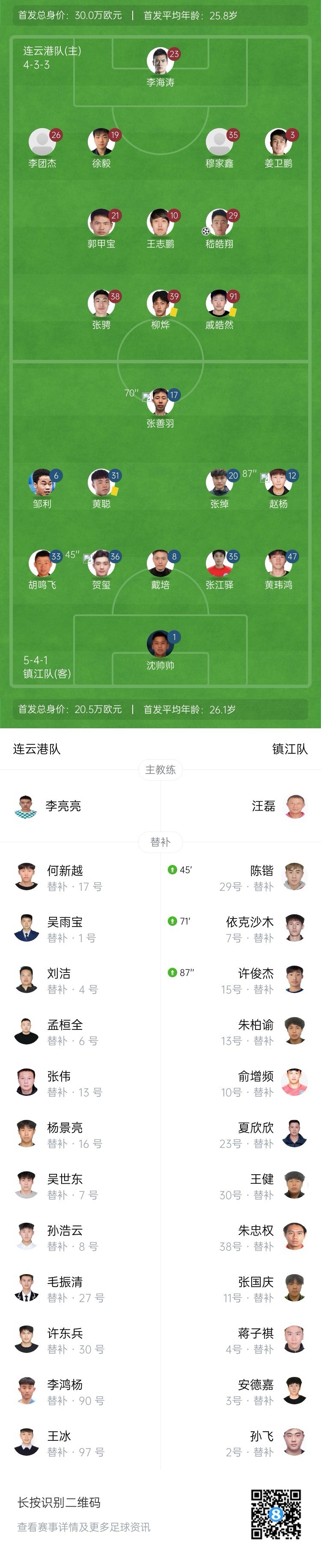 第8分钟,主场作战的连云港队取得领先,嵇皓翔高速插上抢下皮球,他面对门将低射破门,连云港队1-0领先镇江队。↓