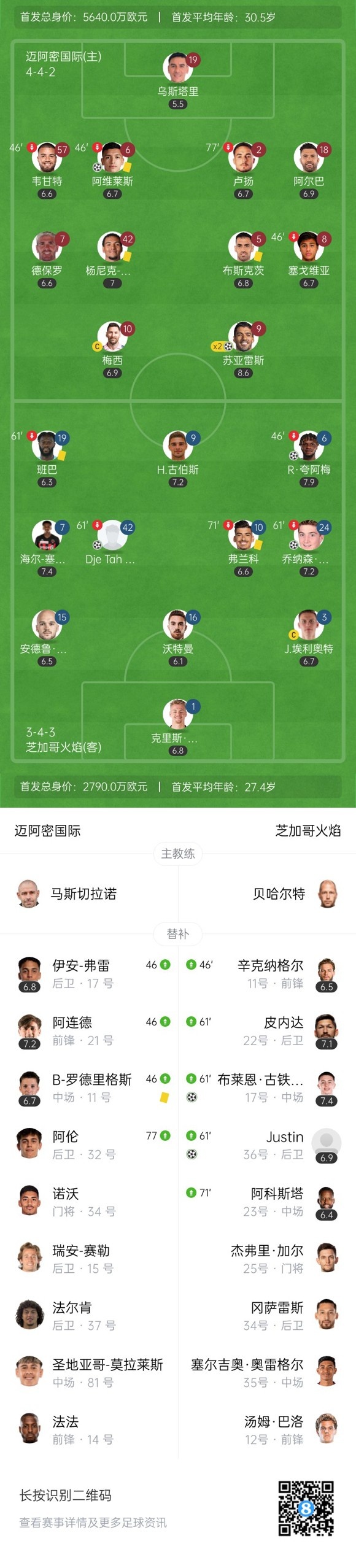 10月1日讯 北京时间10月1日07:30,美职联常规赛迈阿密国际迎战芝加哥火焰的比赛在洛克哈特体育场进行,上半场梅西任意球造险,阿维拉头球闪击首开记录,迪恩小角度推射扩大比分,阿维莱斯补射扳回一城,夸阿梅低射扩大比分,半场结束,迈阿密国际1-3芝加哥火焰。下半场梅西&阿连德中柱,苏亚雷斯双响,雷诺兹包抄破门,古铁雷斯世界波,最终迈阿密3-5芝加哥两轮不胜距榜首7分。