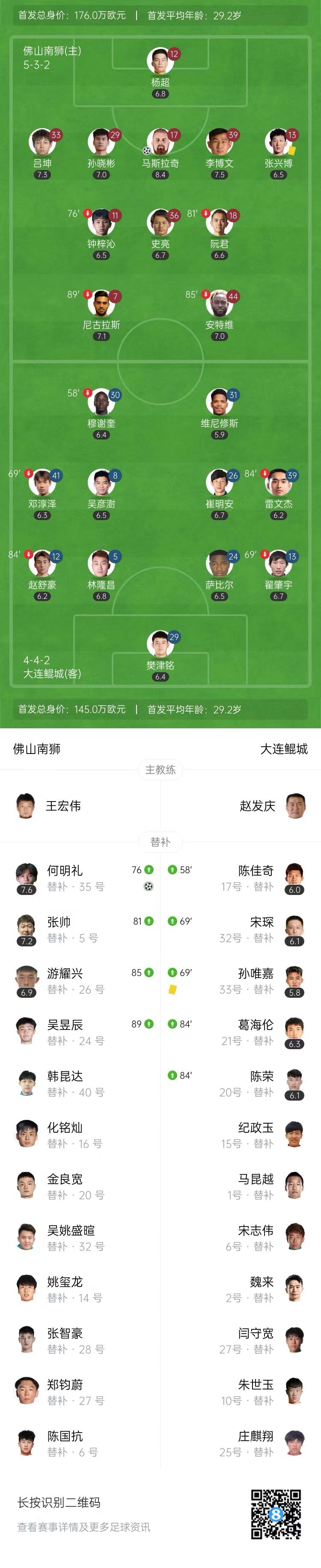 10月4日讯 北京时间10月4日19:30,中甲第25轮,佛山南狮坐镇主场佛山南海体育中心体育场迎战大连鲲城。上半场,张兴博飞铲染黄。下半场,马斯拉奇角球铲射破门,何明礼反击世界波再下一城。全场比赛结束,佛山南狮2-0击败大连鲲城,先赛一场暂时超出降级区4分。