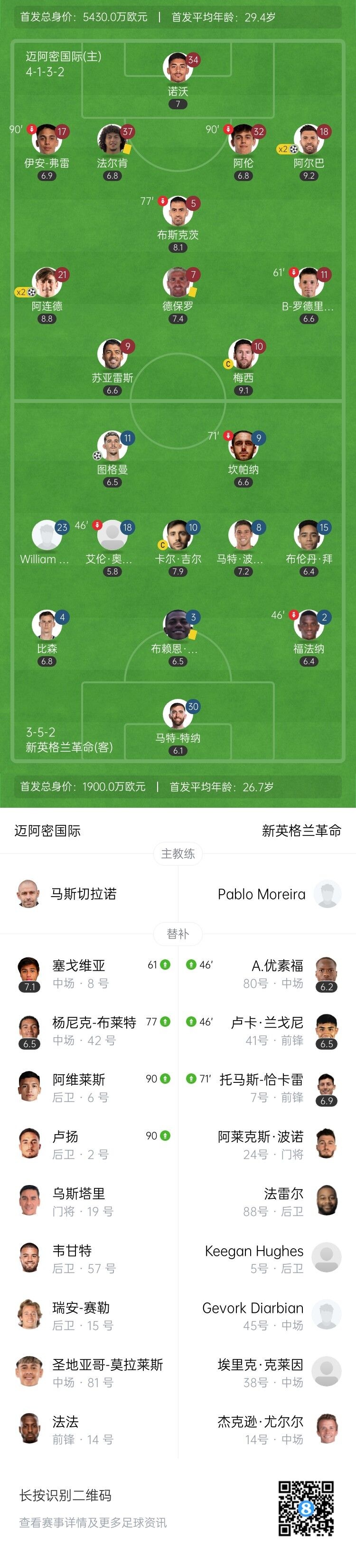 伤停补时4分钟。全场比赛结束,迈阿密国际4-1新英格兰革命。