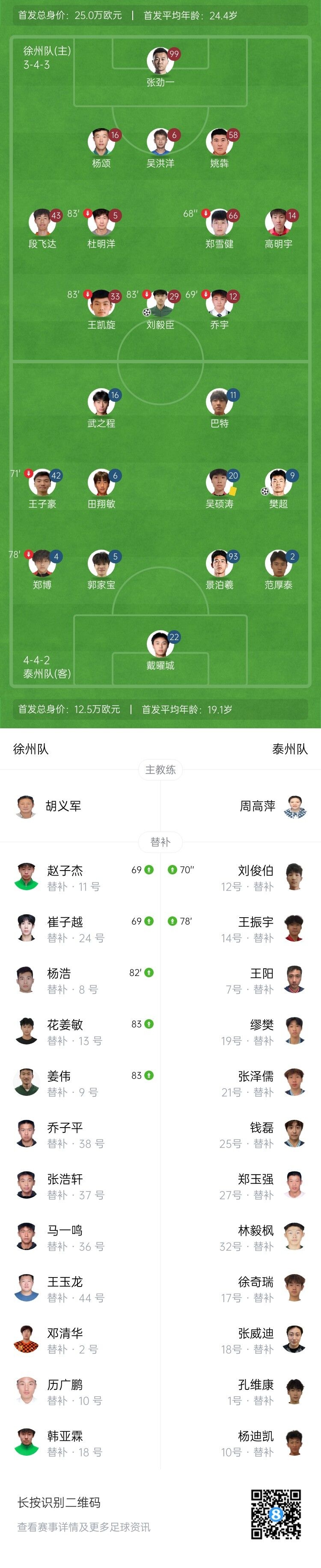 第63分钟,泰州队左路传中,樊超将球砸进远角!1-1!泰州队扳平了比分!↓