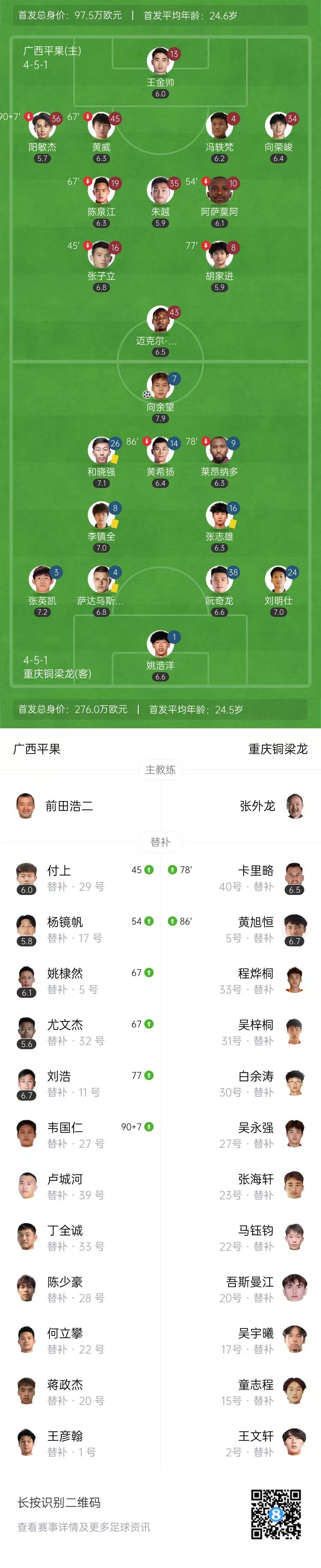 第75分钟,向余望禁区得球转身抽射破门扩大比分,重庆铜梁龙2-0广西平果。↓