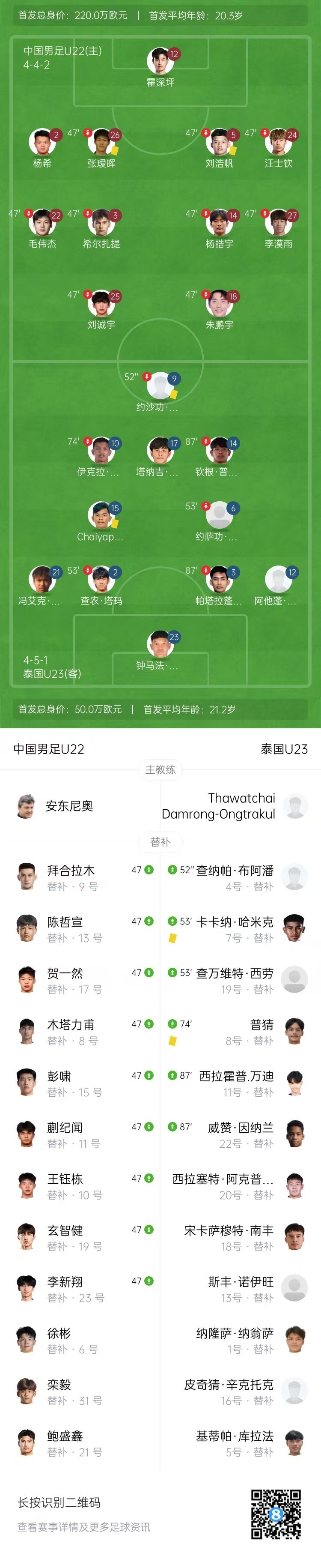 全场比赛结束,U22国足0-0泰国U23。