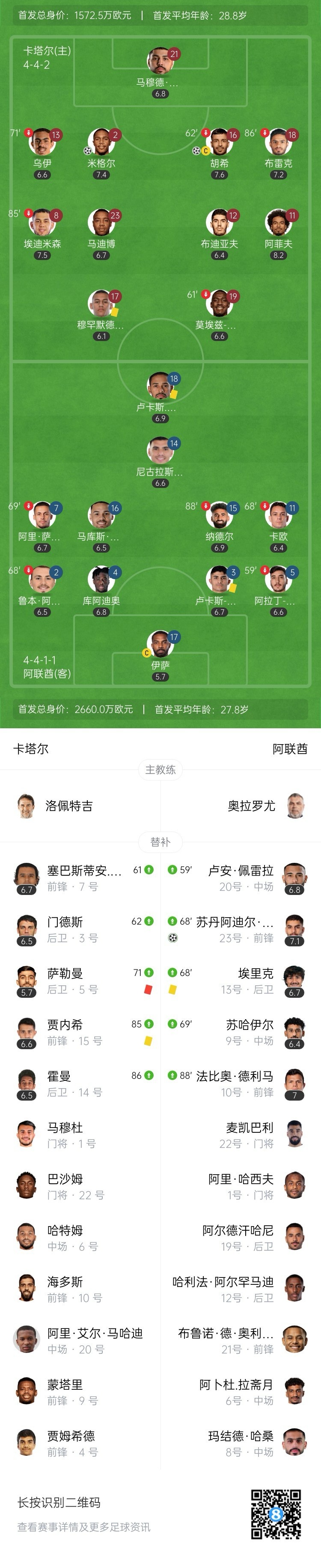 卡塔尔2球领先!阿菲夫任意球两送助攻!第74分钟,阿菲夫再次主罚任意球传中,皮球越过门将伊萨,米格尔后点飞身头球破门,卡塔尔2-0阿联酋!↓
