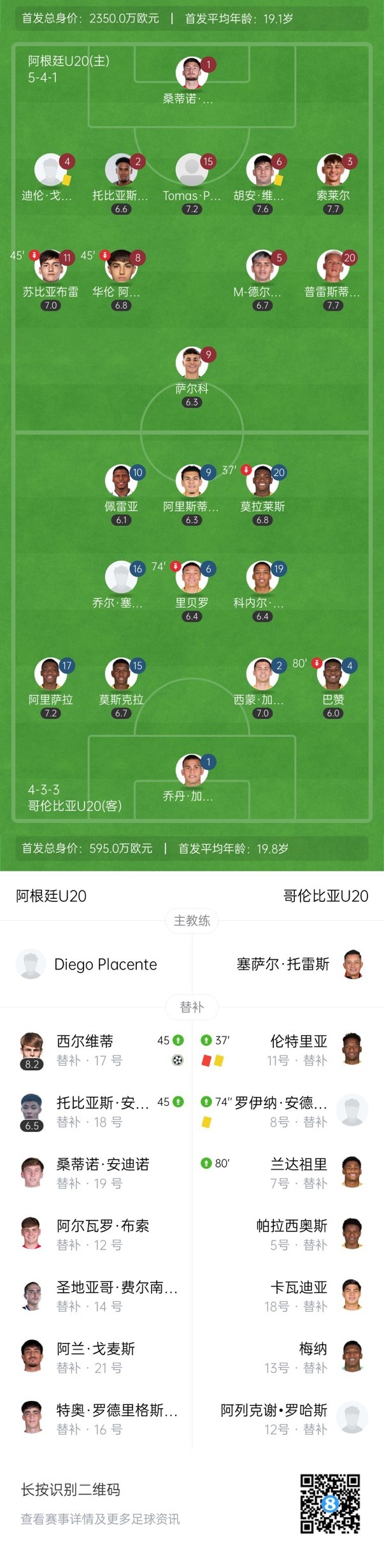 下半场补时5分钟,U20阿根廷1-0哥伦比亚U20。