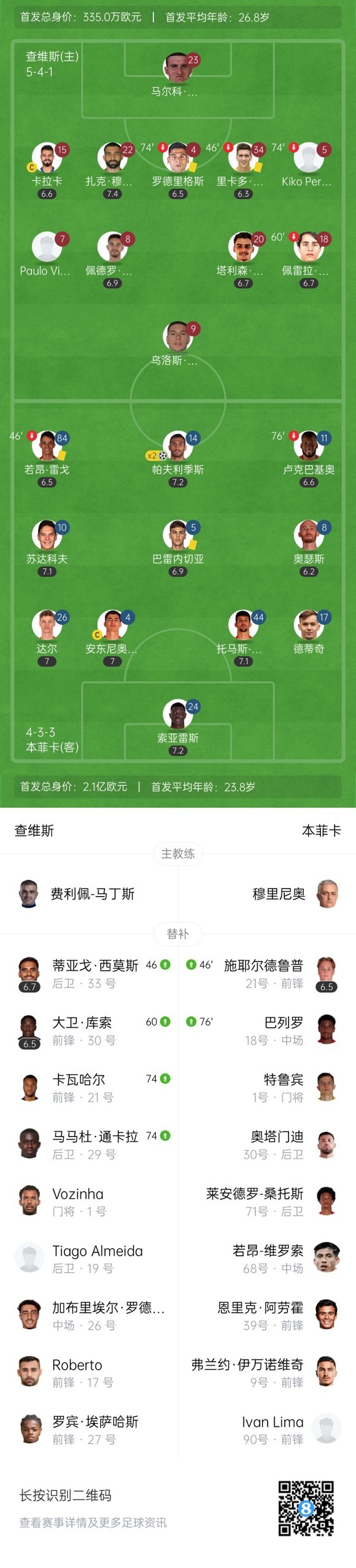 第78分钟,本菲卡扩大比分!苏达科夫中路直塞给到帕夫利季斯转身低射破门,查维斯0-2本菲卡。↓