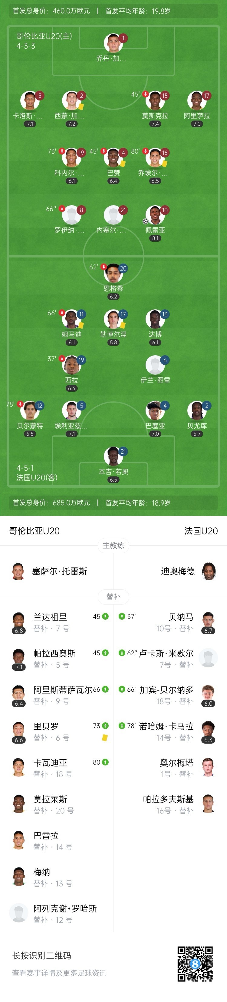 哥伦比亚U20梦幻开局!第2分钟,哥伦比亚U20前场抢断,贝尼特斯做球,奥斯卡-佩雷亚禁区内低射破门,U20哥伦比亚1-0法国!↓