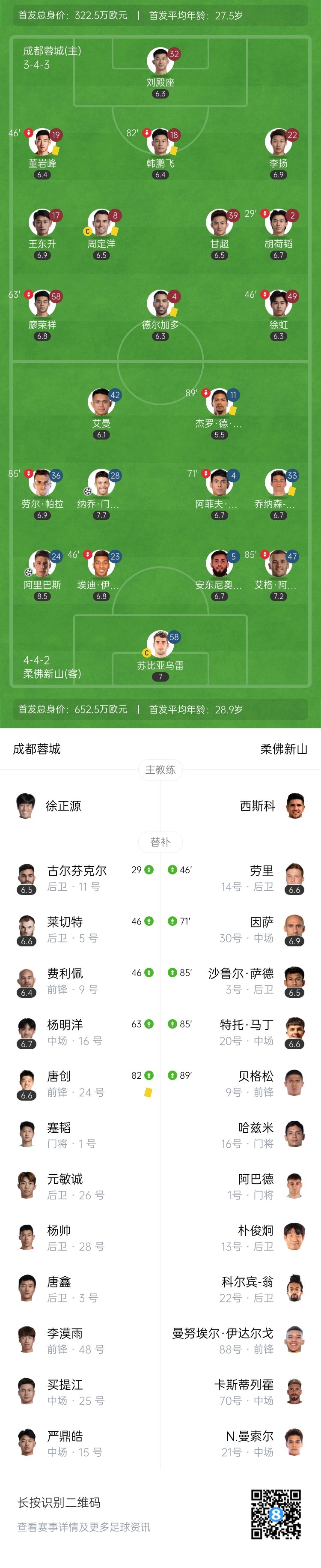 第27分钟,成都蓉城前场任意球,甘超主罚开到禁区内,李扬头球攻门顶偏了↓