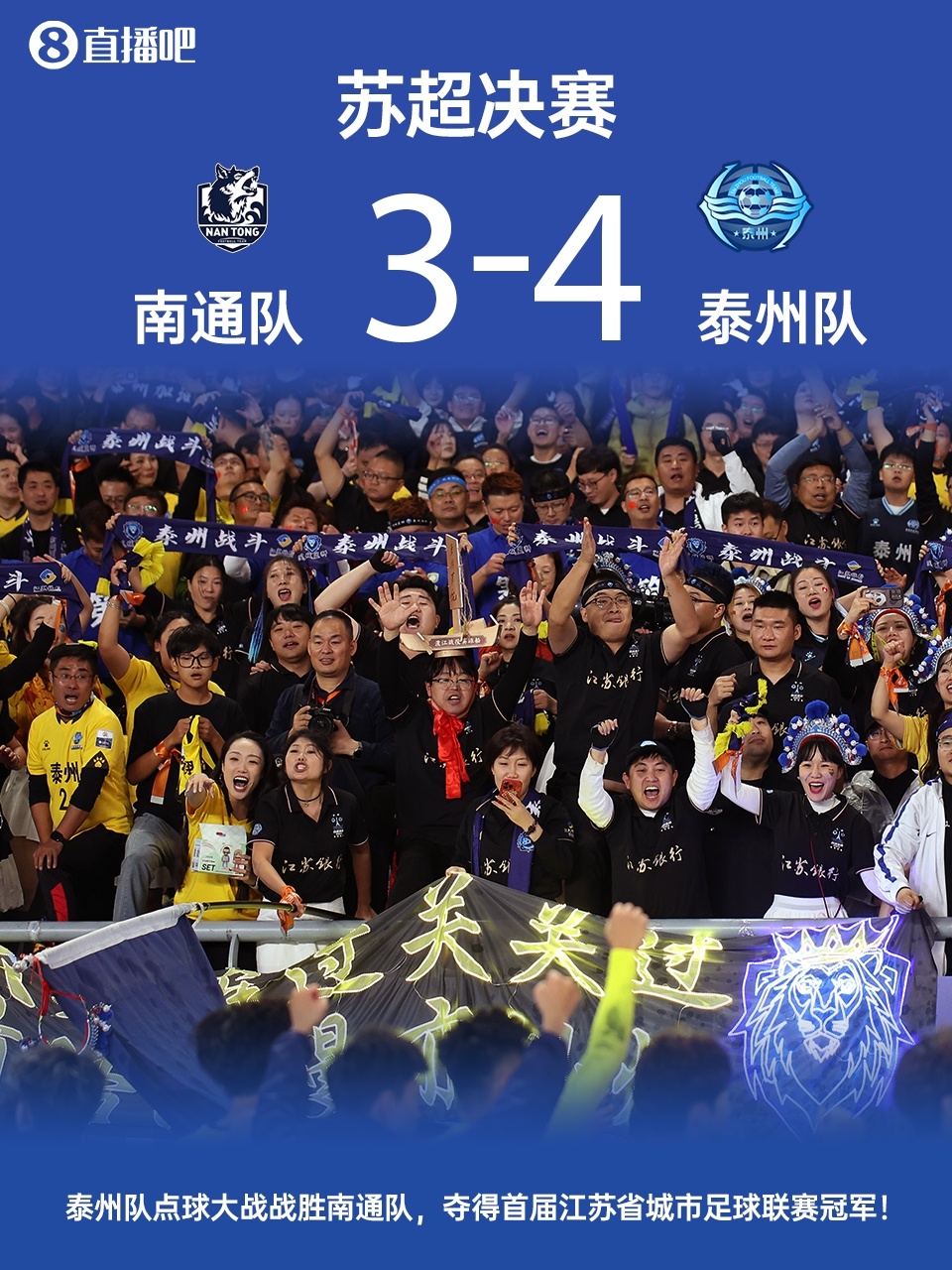 90分钟战罢,南通队0-0泰州队。点球大战,泰州队4-3南通队夺冠。