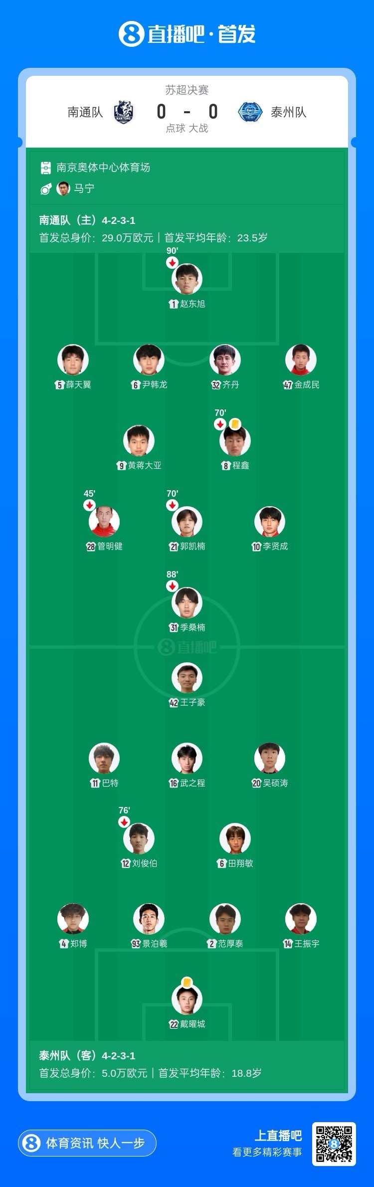 半场战罢,南通队暂0-0泰州队。