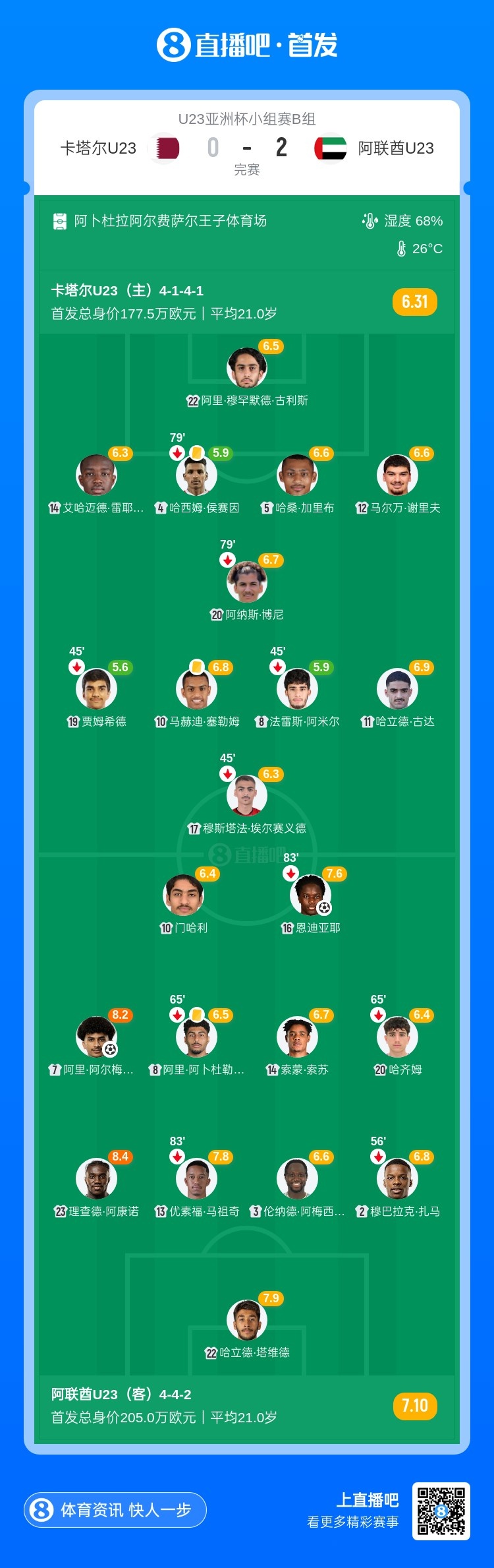 1月8日讯 北京时间0:30,U23亚洲杯小组赛B组卡塔尔U23vs阿联酋U23。上半场,侯赛因开场失点,阿里·阿尔梅马里破门;卡塔尔U23打进一球,但是先出界被判无效!恩迪亚耶帮助阿联酋U23再下一城。下半场,双方均无建树。最终,阿联酋U23首战2-0击败卡塔尔U23,取得开门红。