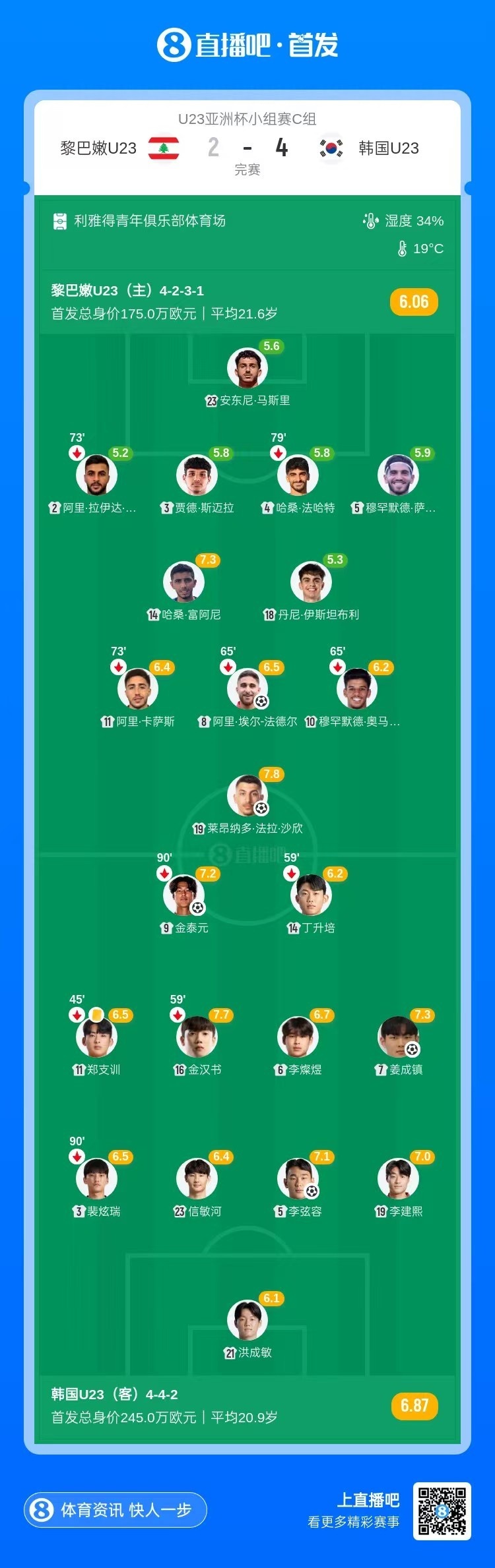 1月10日讯 北京时间19:30,U23亚洲杯小组赛C组黎巴嫩U23vs韩国U23。上半场,莱昂纳多·法拉·沙欣帮助黎巴嫩U23率先破门;随后韩国U23利用角球机会,由李弦容扳平比分!下半场,阿里·埃尔-法德尔帮助黎巴嫩U23再次领先!但随后韩国U23由郑在尚、姜成镇、金泰元连进3球!最终韩国U23两度落后4-2逆转黎巴嫩U23,末轮将战乌兹别克U23。