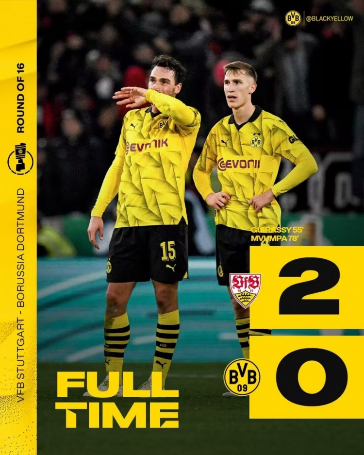 下半场补时5分钟。最终全场比赛结束,斯图加特2-0多特。