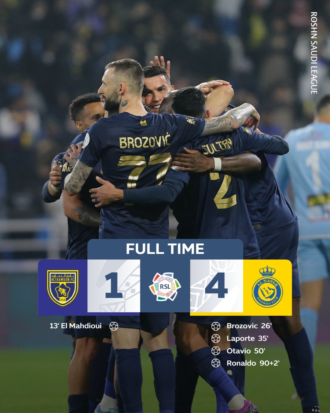 利雅得胜利首发:44-阿奇迪、2-哈纳姆、27-拉波尔特、5-阿姆里、15-特莱斯、17-哈巴利、77-布罗佐维奇(90+3'8-苏莱西姆)、25-奥塔维奥(90+3'14-纳吉)、94-塔利斯卡(89'6-塞科-福法纳)、10-马内(86'29-加里卜)、7-C罗