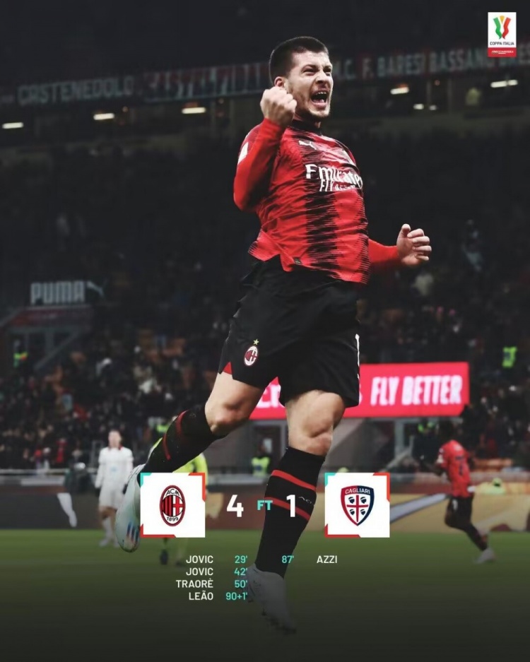 1月3日讯 意杯第3轮1/8决赛,AC米兰主场vs卡利亚里。上半场特奥两次助攻约维奇破门。易边再战,19岁特劳雷打进个人米兰首球,尾声阶段替补登场的阿齐帮助卡利亚里扳回一球,补时莱奥再下一城。最终米兰4-1卡利亚斯晋级八强,下轮对手将是萨索洛和亚特兰大胜者。