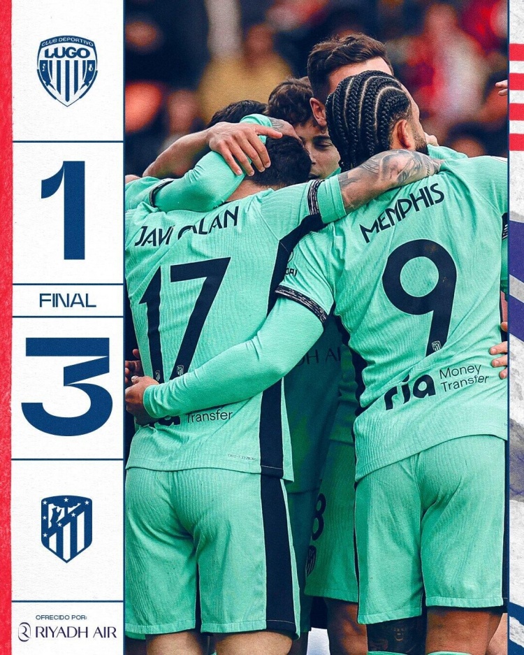 1月7日讯北京时间1月6日23时,国王杯第3轮,马德里竞技客场对阵卢戈。上半场,科雷亚为马竞首开纪录,安东内蒂破门将比分扳平!半场战罢,马德里竞技暂1-1卢戈,下半场,德佩连入两球帮助马竞再次取得领先,吉梅内斯上演门线解围,莫拉塔射门击中横梁!全场比赛结束,马德里竞技3-1卢戈。
