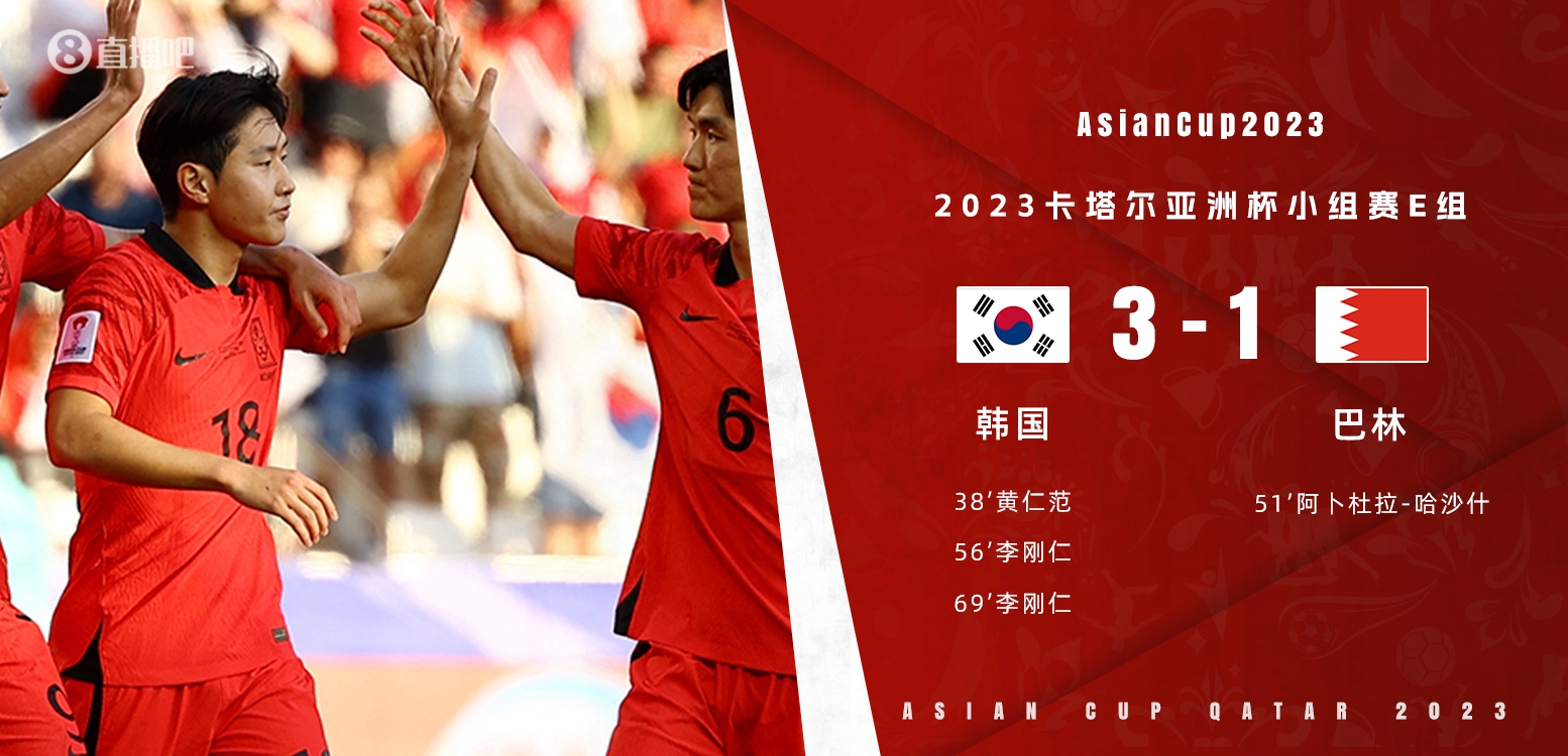1月15日讯 北京时间1月15日19:30,亚洲杯小组赛E组首轮韩国迎战巴林的比赛,上半场曹圭成失良机,李在城助攻黄仁范推射破门,马宁半场出示五张黄牌,半场结束,韩国1-0巴林。下半场哈什萨什推射扳平,李刚仁双响,孙兴慜两失单刀,最终韩国3比1巴林取得开门红。