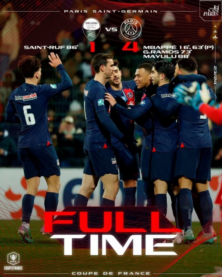 1月21日讯 北京时间1月21日凌晨3点45分,2023-24赛季法国杯1/16决赛展开角逐,巴黎圣日耳曼客场挑战奥尔良。上半场姆巴佩首开纪录,下半场姆巴佩两射两传,近6场贡献10球4助,贡萨洛-拉莫斯和马尤卢破门。最终巴黎客场4-1战胜奥尔良,巴黎顺利晋级法国杯16强,取得各赛事5连胜。