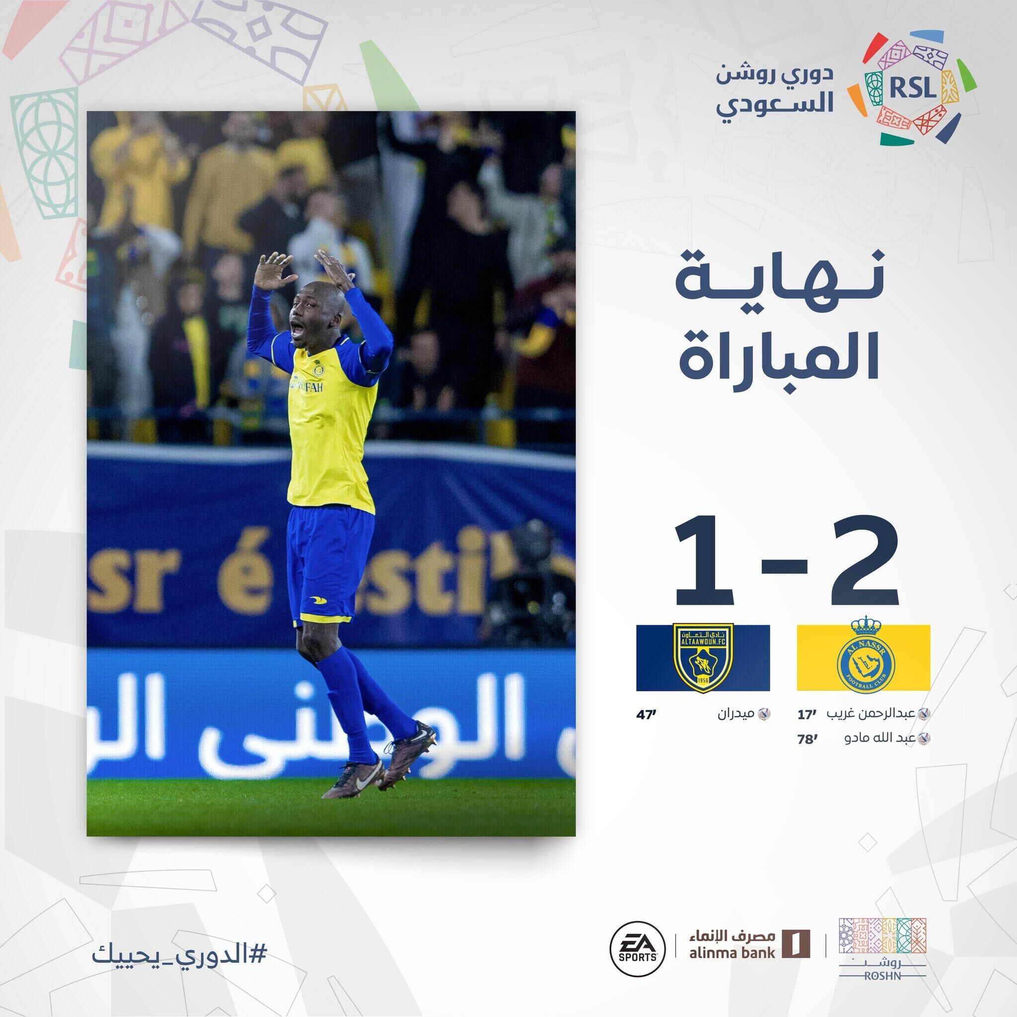 全场比赛结束,利雅得胜利2-1布赖代合作。