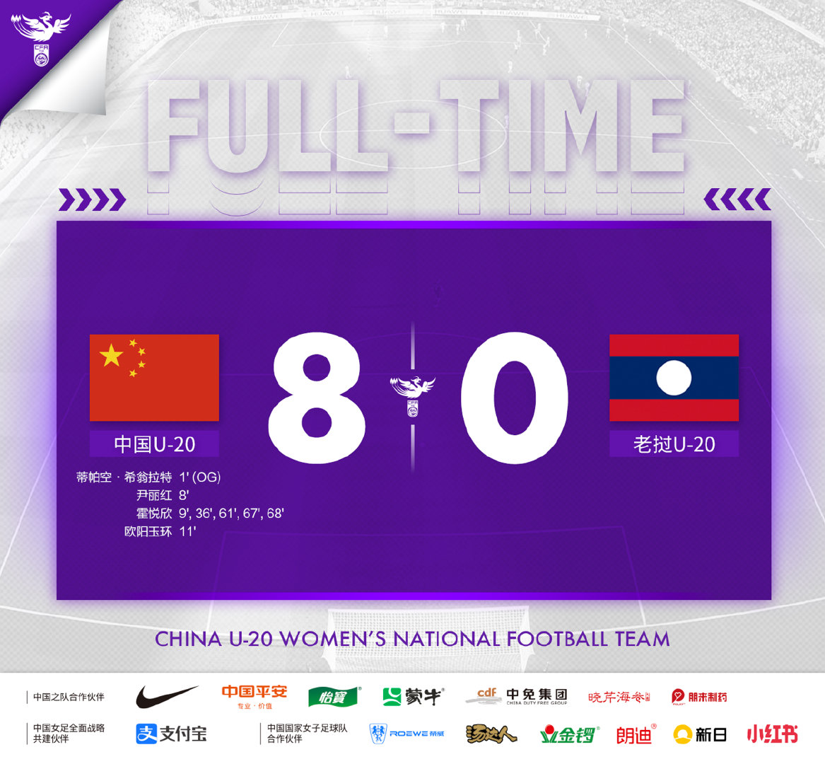 伤停补时2分钟。全场比赛结束,中国8-0老挝。