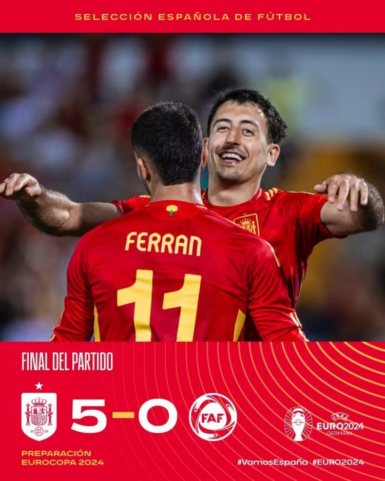 6月6日讯 北京时间6月6日凌晨3:30,国际足球友谊赛,西班牙对阵安道尔。上半场库巴西助攻佩雷斯爆射进球,莫拉塔破门但越位在先被吹,西班牙暂1-0安道尔;下半场奥亚萨瓦尔帽子戏法,佩雷斯助攻,费兰-托雷斯传射,最终西班牙5-0安道尔。