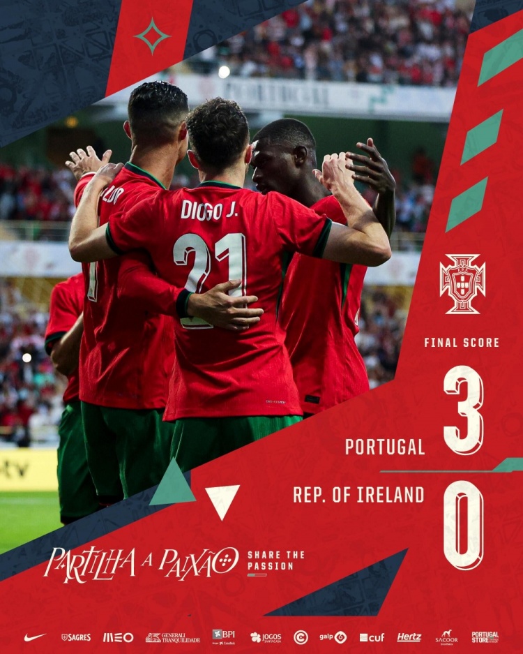 6月12日讯 足球友谊赛,葡萄牙对阵爱尔兰。上半场,B费助攻菲利克斯先拔头筹,C罗任意球中柱。易边再战,C罗完成梅开二度。最终葡萄牙3-0爱尔兰。