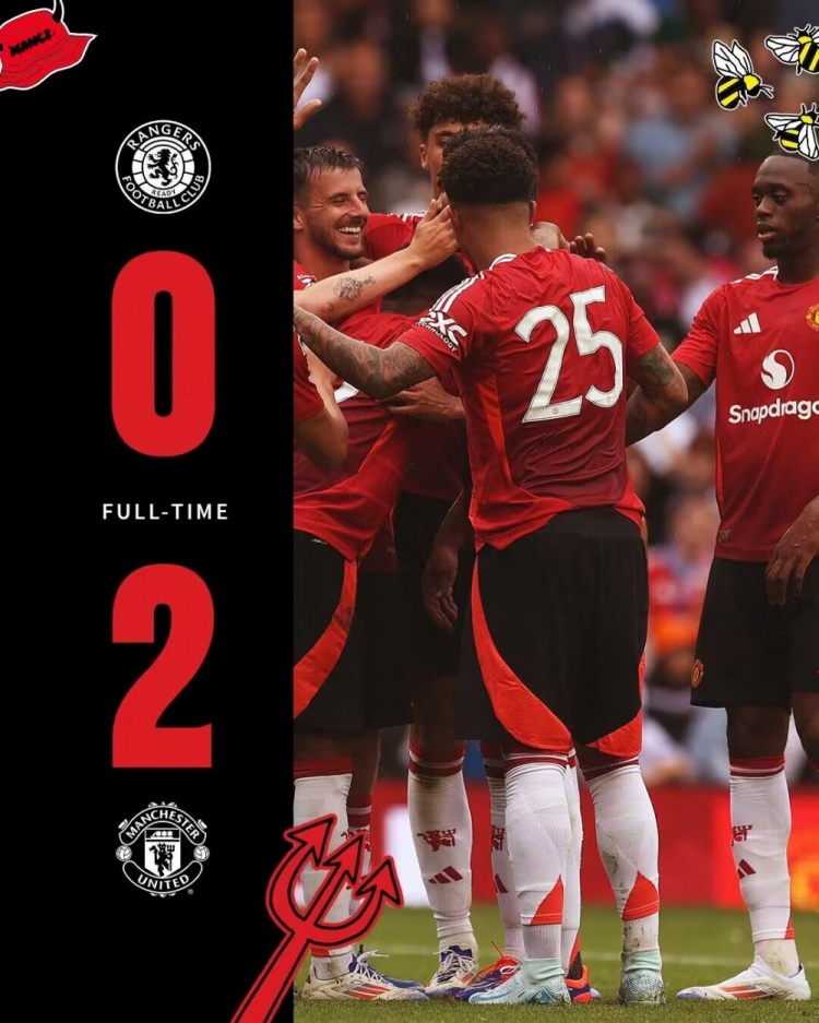 7月21日讯 北京时间23:00,曼联在第2场季前赛中迎战格拉斯哥流浪者。本场比赛,曼联新援约罗首发,桑乔回归先发出战。上半场,芒特助攻阿马德-迪亚洛破门。下半场,休吉尔爆射近角建功。最终,曼联2-0击败格拉斯哥流浪者,取得季前赛首胜。