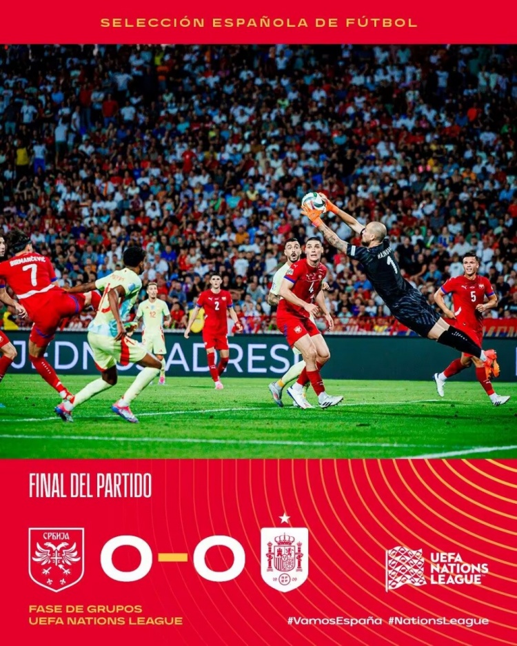 9月6日讯 欧国联A联赛第1轮,西班牙客战塞尔维亚。上半场,约维奇错失良机。易边再战,卡瓦哈尔也是错失绝佳机会,亚马尔屡造险。最终,塞尔维亚0-0西班牙。