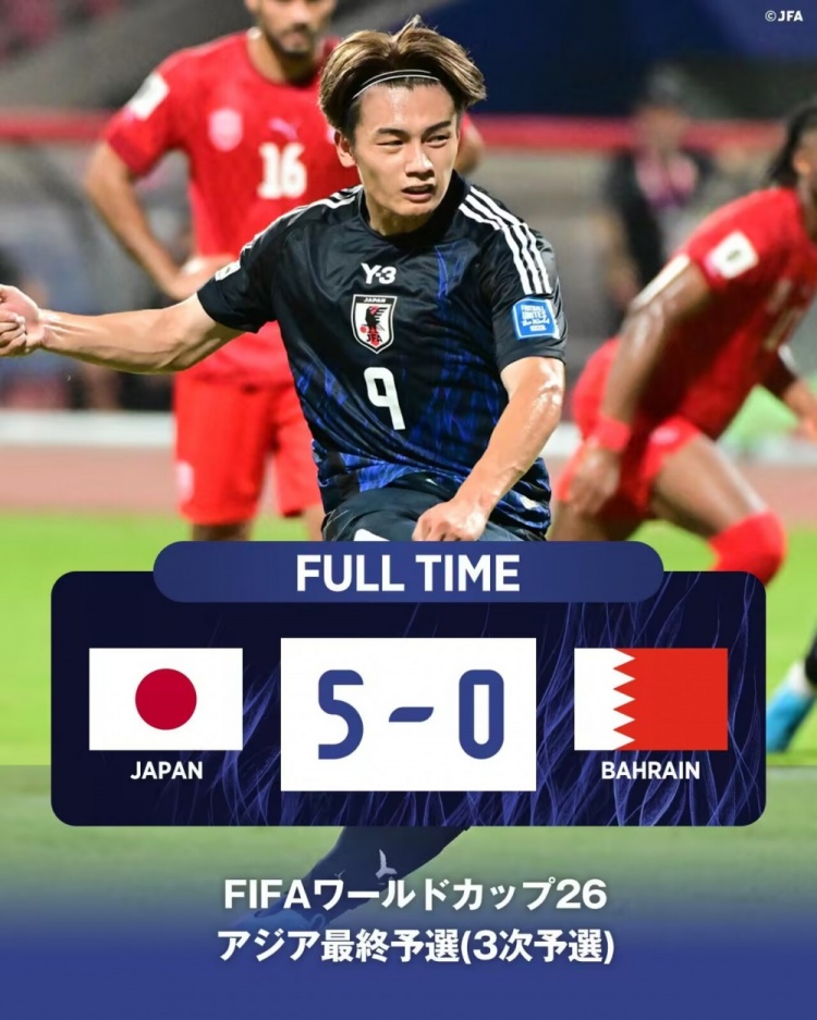 全场比赛结束,日本5-0巴林。