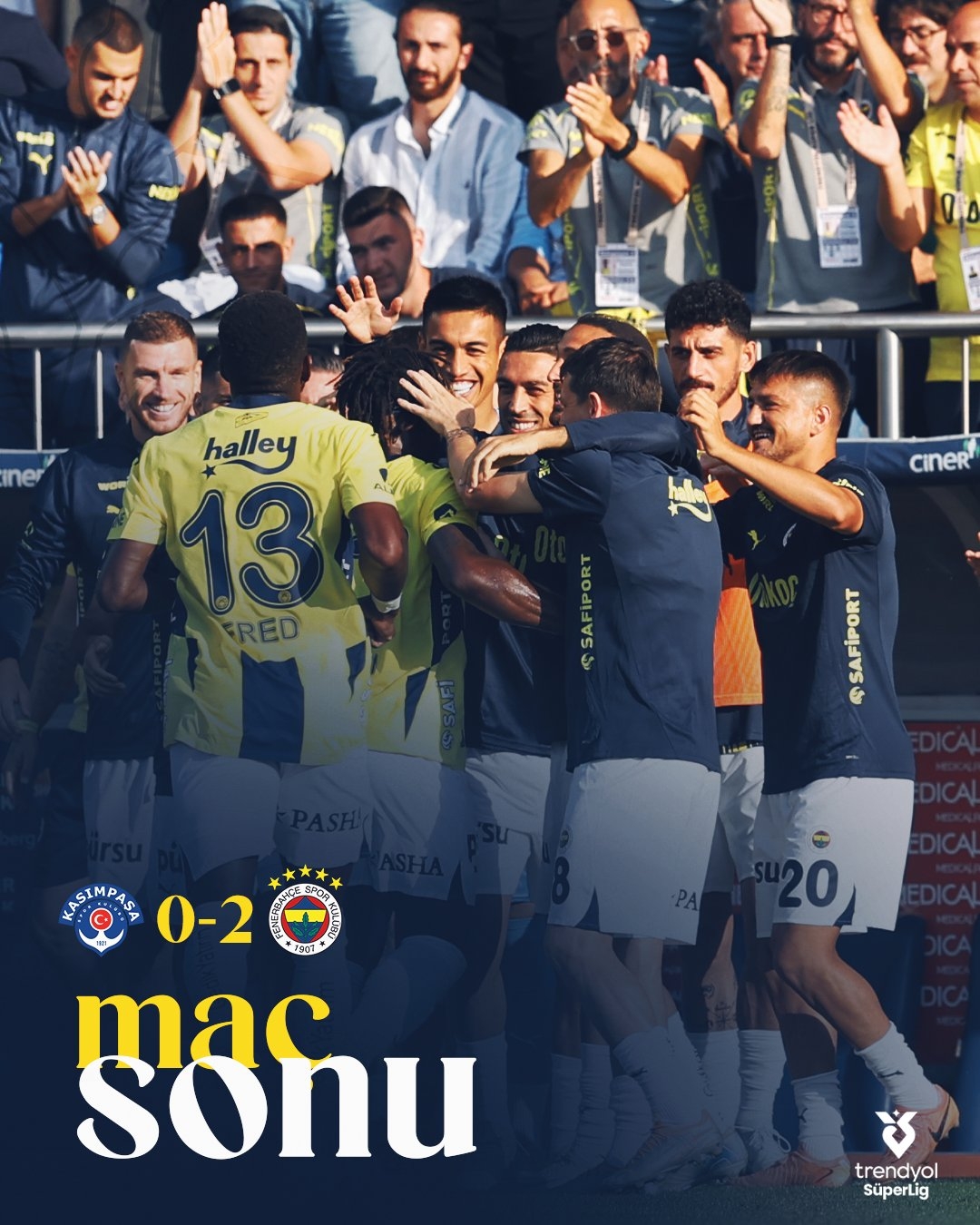 费内巴切首发:40-利瓦科维奇、16-穆尔杜(81’95-优素福)、4-瑟云聚、50-贝考、24-奥斯特沃德、13-弗雷德(86’8-延达斯)、5-尤克塞克、10-塔迪奇(81’34-阿姆拉巴特)、53-希曼斯基、97-圣马克西曼(63’17-卡维奇)、19-恩内斯里(63’9-哲科)