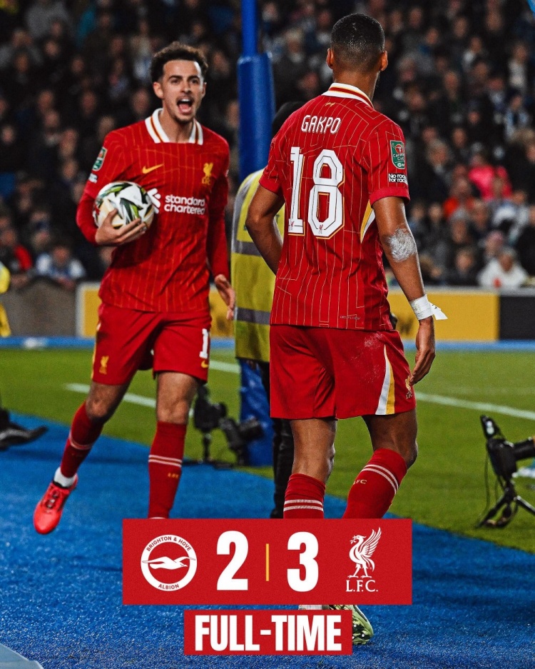 10月31日讯 北京时间10月31日03:30,英联杯第四轮利物浦挑战布莱顿的比赛,上半场兰普泰失单刀,迪亚斯门前失良机,下半场加克波远射破门打破僵局,亚罗萨献神扑,加克波爆射扩大比分,阿丁格拉补射扳回一城,迪亚斯低射破门杀死比赛,兰普泰远射打在宽萨身上变线破门,最终利物浦3-2布莱顿晋级八强。