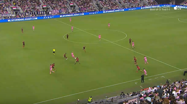第76分钟,迈阿密国际禁区内有球员倒地,但裁判没有吹停,斯利什高高跃起头球破门!3-2!亚特兰大联再次超出比分!↓