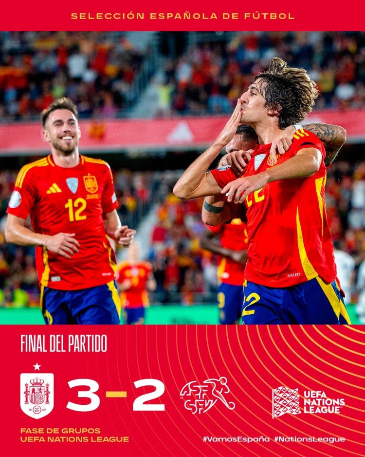 11月19日讯 欧国联A4组第6轮,西班牙主场对阵瑞士。上半场,莫拉塔造点,佩德里失点,皮诺补射破门。易边再战,乔尔错失良机后个人秀建功,希尔进球再次帮助西班牙领先,泽奇里点射再次扳平,萨拉戈萨补时点射绝杀。最终西班牙3-2瑞士,2024年正式比赛全年不败。积分榜方面,西班牙5胜1平小组头名。