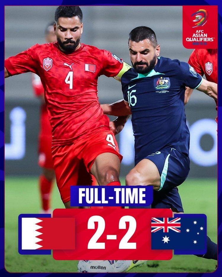 11月20日讯 北京时间11月20日凌晨2时15分,世预赛亚洲区第三阶段C组第6轮,巴林主场迎战澳大利亚。上半场,延吉闪击破门首开纪录。澳大利亚半场1-0领先巴林。下半场,阿卜杜勒贾巴尔打进两球帮助巴林反超,延吉补时阶段完成绝平,最终澳大利亚2-2战平巴林。本轮战罢,澳大利亚积7分排名小组第二,巴林6分排名第五,国足同积6分,但是净胜球劣势跌至榜尾。