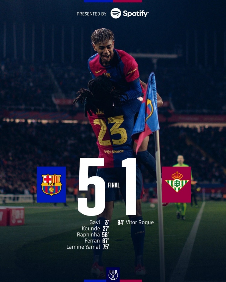 1月16日讯 国王杯1/8决赛,巴萨坐镇主场蒙锥克球场迎战贝蒂斯。上半场,加维闪击破门,奥尔莫中柱,孔德爆射建功后进球被吹。易边再战,亚马尔进球也被吹越位后再次破门,拉菲尼亚、费兰进球,孔德送点罗克点射破旧主。最终,巴萨主场5-1贝蒂斯晋级8强。