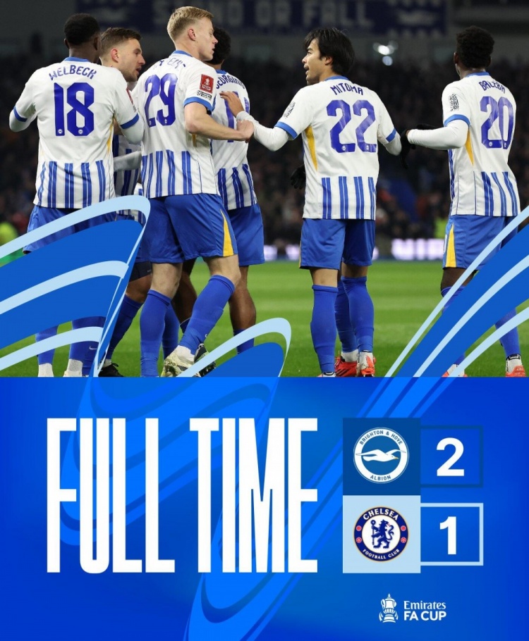 2月9日讯 北京时间2月9日4:00,足总杯第4轮,切尔西做客美国运通社区球场挑战布莱顿。上半场,帕尔默造维尔布鲁根扑救乌龙,鲁特尔头槌扳平比分。下半场,三笘薰挑射建功反超比分。最终,切尔西客场1-2被布莱顿逆转,止步足总杯32强。