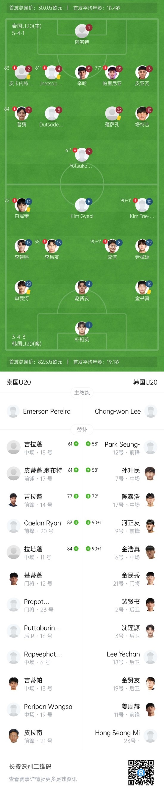 下半场补时4分钟,U20泰国1-4韩国U20。