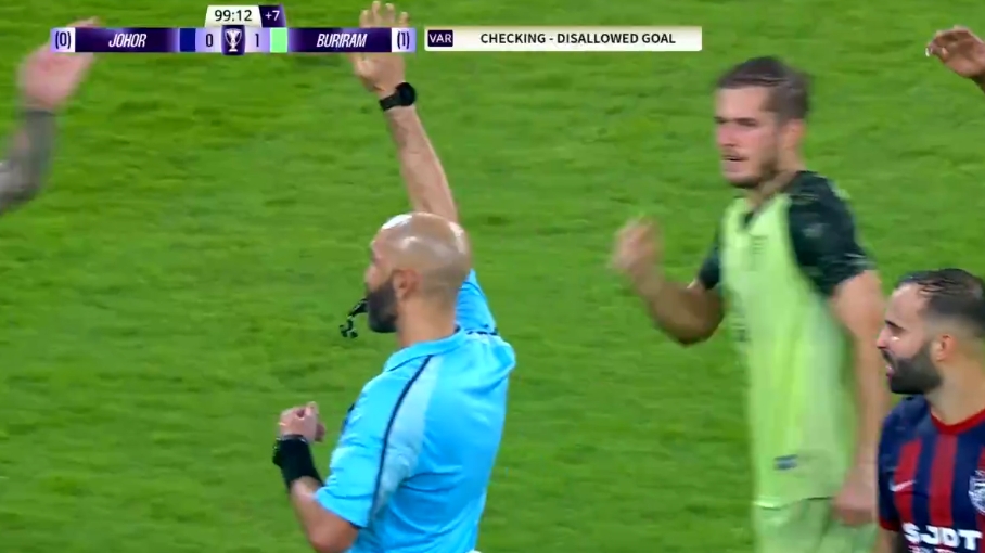 随后VAR介入,长时间回看后,最终认定越位在先进球无效!主裁判在认定进球无效的同时吹响了全场比赛结束的哨音!