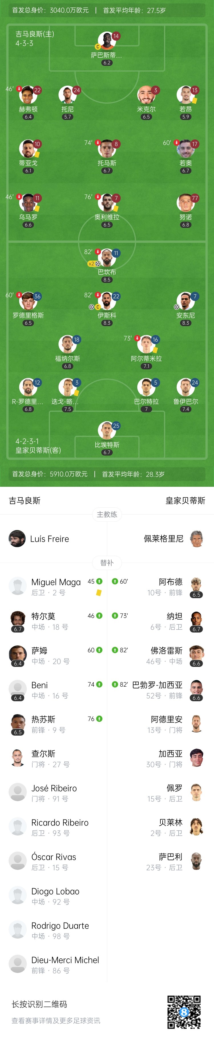第80分钟,安东尼右路突破杀进禁区,传给门前伊斯科!后者轻松破门!安东尼助攻双响!贝蒂斯4-0吉马良斯,总比分6-2领先↓