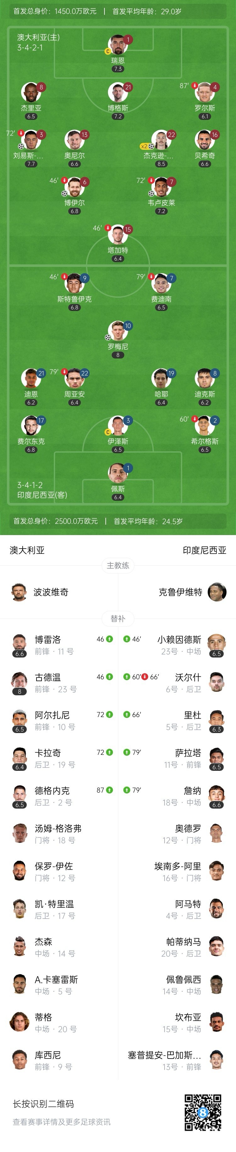 3月20日讯 北京时间3月20日17:10,世预赛亚洲区第三阶段C组第7轮,澳大利亚vs印尼。上半场,迪克斯失点,澳大利亚队3分钟内依靠博伊尔和韦卢皮莱打入两球,杰克逊-欧文再入一球;下半场,古德温助攻米勒和杰克逊-欧文破门,罗梅尼扳回一城。最终,澳大利亚队主场5-1大胜印尼队,7战积10分继续位列第二,先赛一场领先第三4分,印尼队积6分跌至第5位。