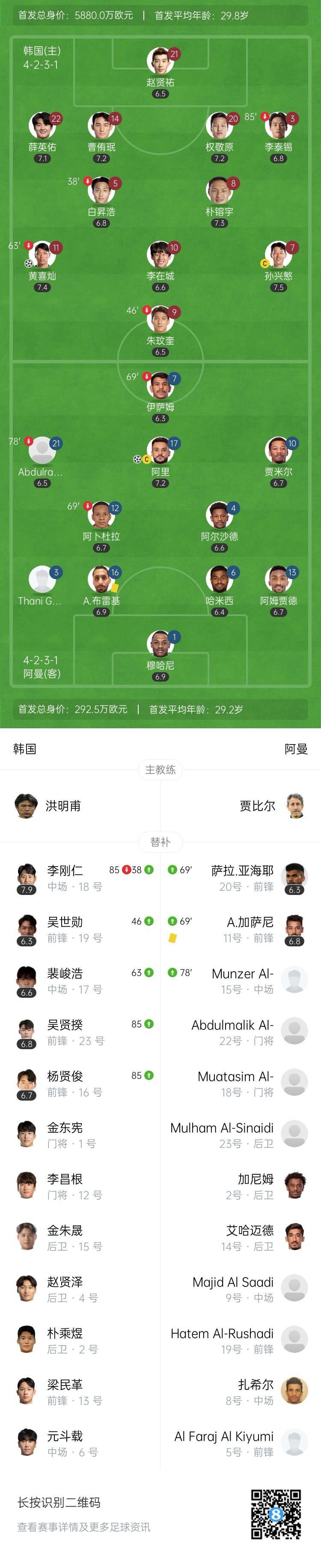 全场比赛结束,韩国队1-1战平阿曼队。