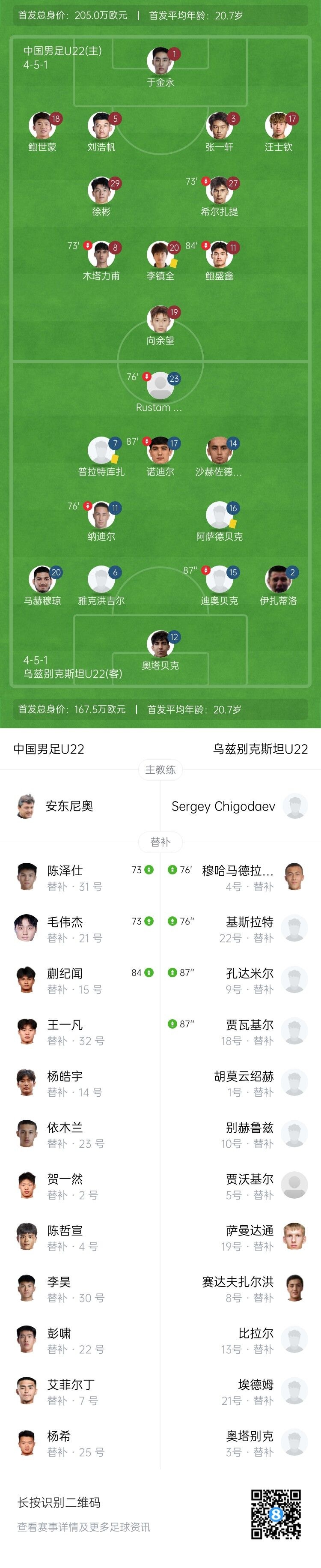 3月20日讯 北京时间3月20日晚上19:35,足球友谊赛,中国U22坐镇盐城奥体中心体育场迎战乌兹别克斯坦U22。上半场,双方均无建树。下半场,木塔力甫抢点险些破门,希尔扎提伤退。全场结束,中国U22以0-0乌兹别克斯坦U22。