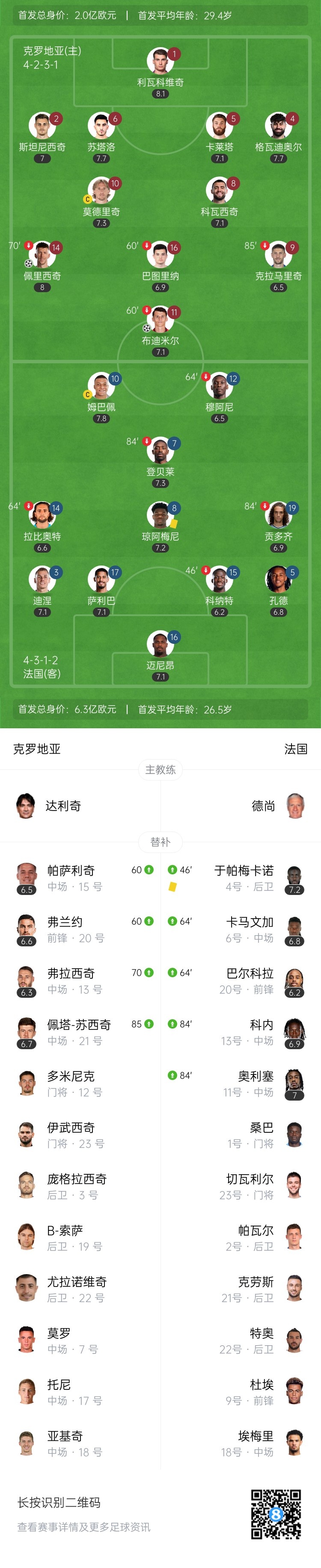 下半场补时4分钟。最终全场比赛结束,克罗地亚2-0法国。