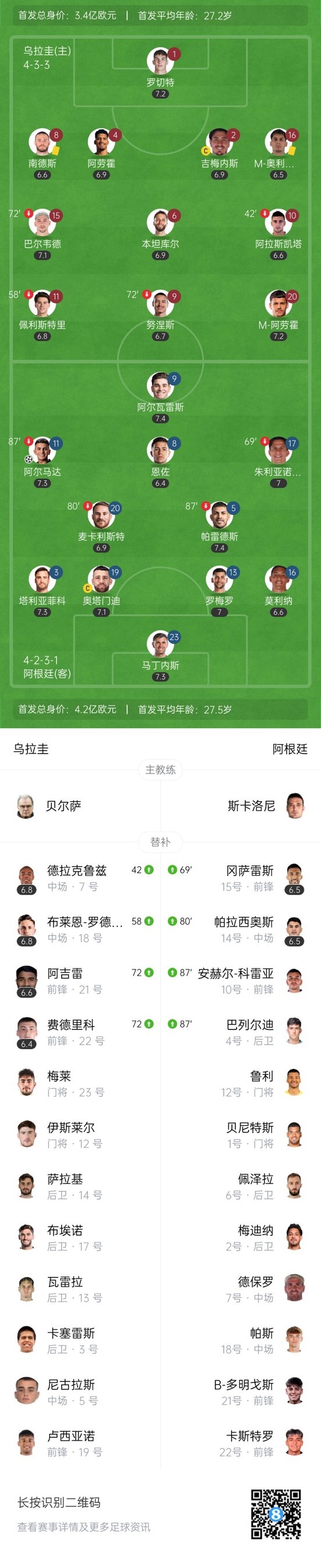 第68分钟,阿根廷打破僵局!阿尔马达左路弧顶拿球一脚远射世界波破门,乌拉圭0-1阿根廷。↓