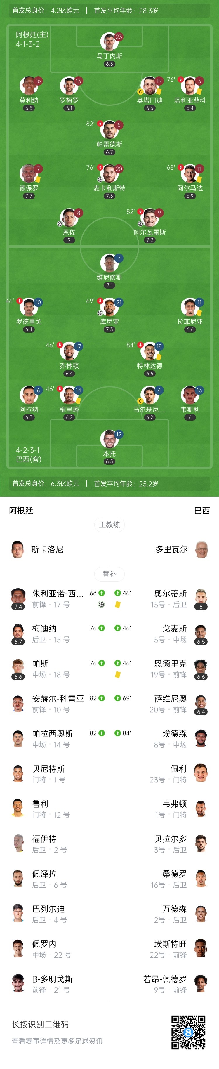 第37分钟,阿根廷通过角球机会策动攻势,最终恩佐挑传禁区内,麦卡利斯特抢点破门,阿根廷3-1巴西。↓