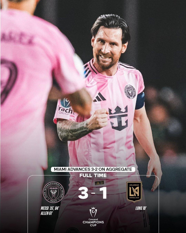 4月10日讯 北京时间4月10日8点,美冠杯四分之一决赛次回合,迈阿密国际在主场迎战洛杉矶FC,首回合迈阿密国际0-1遭遇失利。上半场,阿隆朗率先破门,梅西快发任意球破门被吹,但随后他爆射破门扳平比分。下半场,阿伦头球建功,苏亚雷斯进球被吹,桑托斯送点,梅西点球命中,乌斯塔里两扑单刀。最终迈阿密国际3-1击败洛杉矶FC,总比分3-2逆转完成晋级。迈阿密国际半决赛的对手是墨西哥美洲狮vs温哥华白浪的胜者