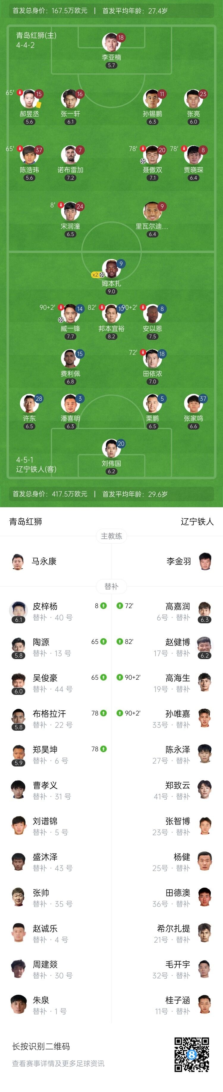 4月26日讯 北京时间4月26日下午15:30,中甲第6轮,青岛红狮坐镇天泰体育场迎战辽宁铁人。上半场,孙润潼伤退,邦本宜裕助攻姆本扎破门,安以恩助臧一锋进球,聂傲双扳回一球,姆本扎梅开二度。下半场,双方均无建树。全场结束,青岛红狮1-3不敌辽宁铁人。本场过后,辽宁铁人积15分暂升榜首,青岛红狮积3分排名倒数第二。