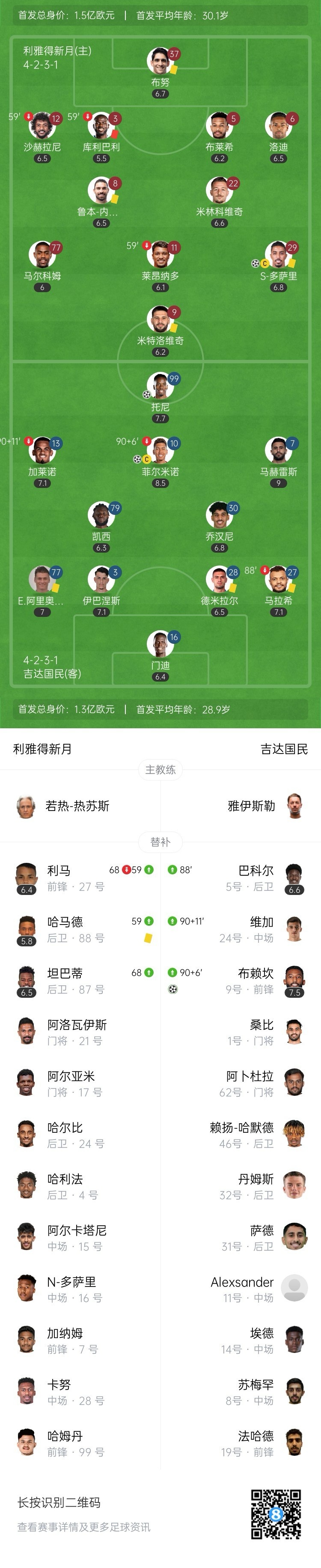 多萨里破门!新月扳回一城!第43分钟,洛迪左路传中,凯西回防解围失误,多萨里领球杀入禁区抽射破门,利雅得新月1-2吉达国民!↓