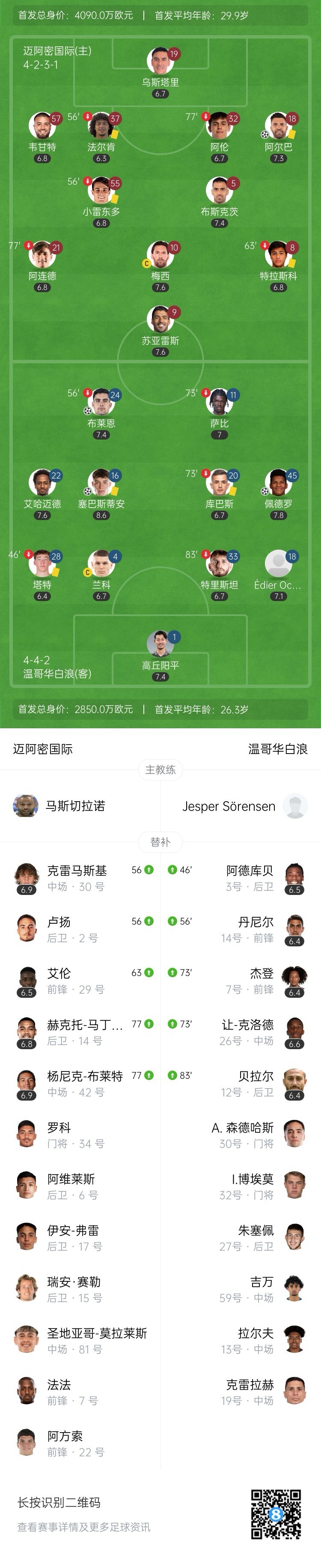 全场比赛结束,迈阿密国际主场1-3不敌温哥华白浪,迈阿密总比分1-5遭温哥华双杀淘汰,无缘美冠杯决赛。